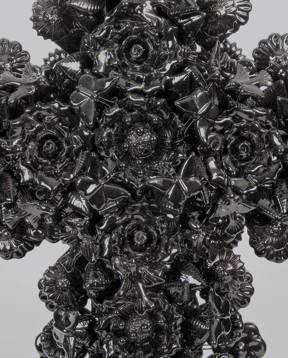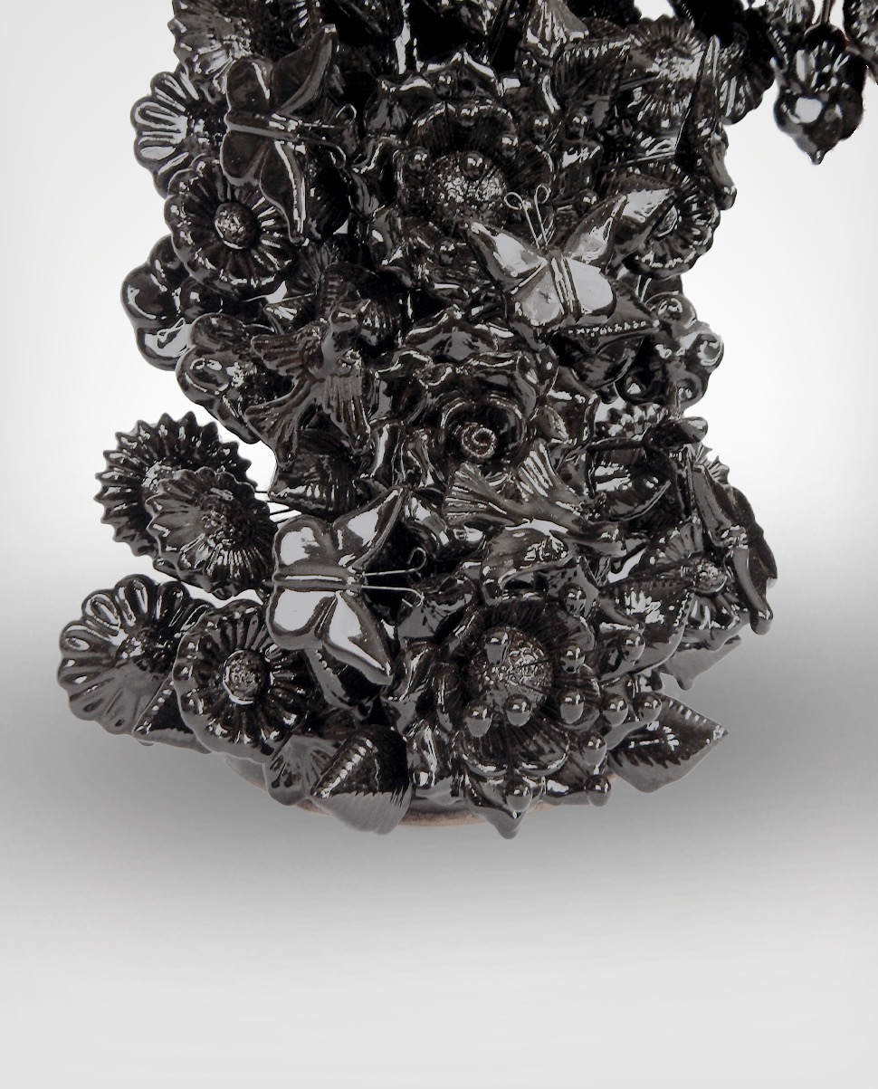 Hermosa cruz decorada con mariposas, flores y pájaros como un homenaje al paso de las mariposas monarcas por la región, su vidriado sobrio y elegante se antoja para un nicho en casa o un regalo para alguien especial.