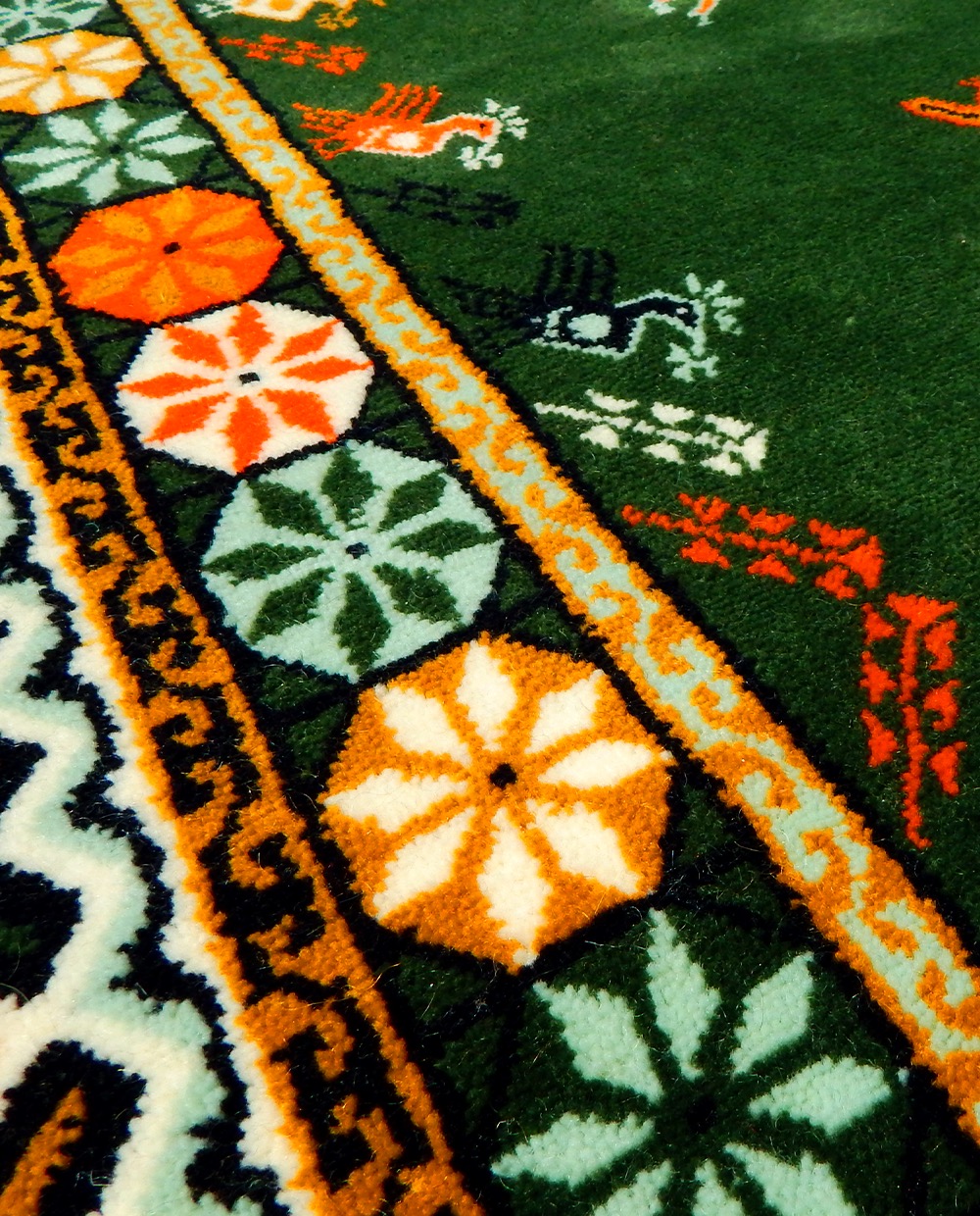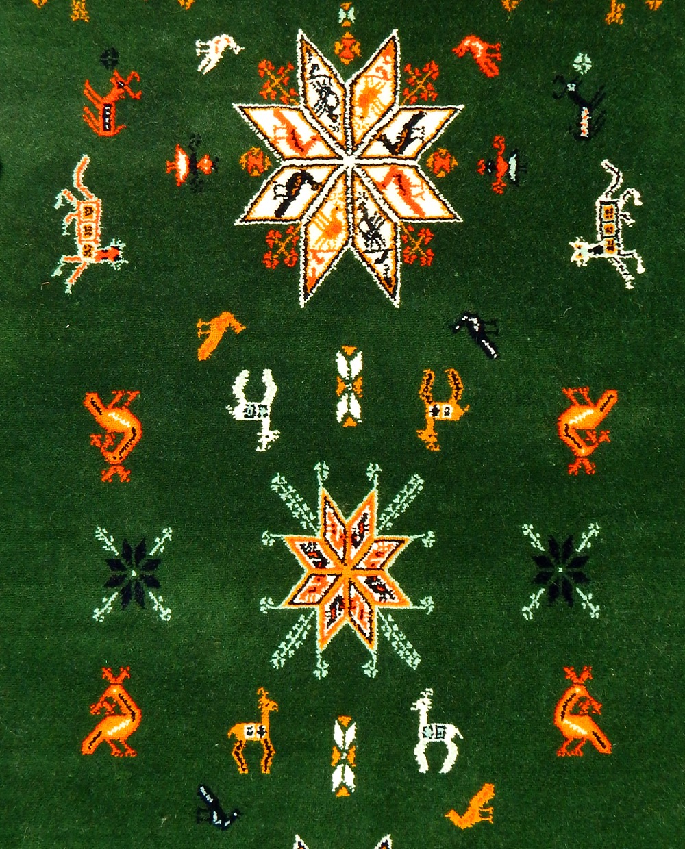 Los Mazatecos son una etnia cuyo nombre en idioma español significa venado el cual se representa repetidamente en las artesanías que elaboran, ejemplo de ello es este tapete de lana virgen anudado a mano en telar de pared y teñido con materiales minerales, fibras vegetales y animales. Cada tapete es único e irrepetible razón por la que se pueden encontrar pequeñas variaciones con las imágenes en cuanto a diseño y/o color.